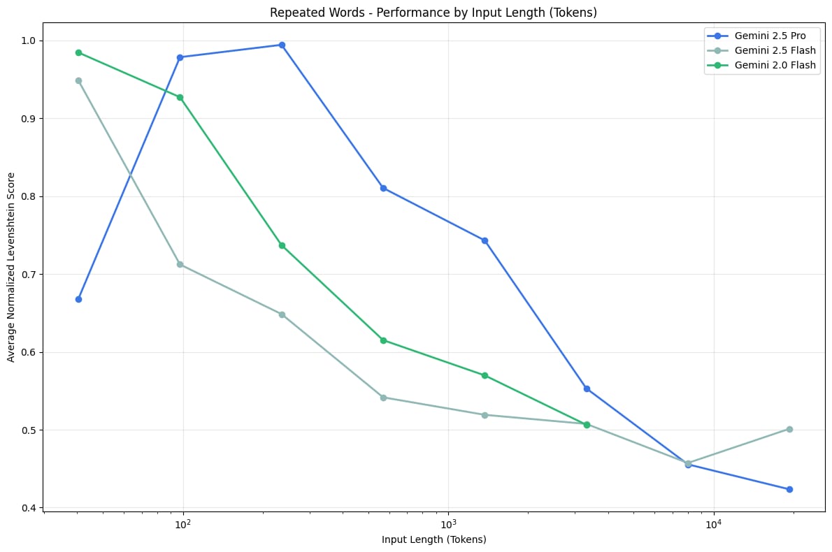 Repitieron el experimento con 25, 50, 75, 100, 250, 500, 750, 1000, 2500, 5000, 7500, 10000 palabras. A medida que aumentaba la longitud de la secuencia a repetir, todos los modelos empezaban a fallar. Algunos se olvidaban de la palabra única (manzanas), otros empezaban a repetir patrones extraños, y otros simplemente se rompían y empezaban a escupir basura o se negaban a continuar.